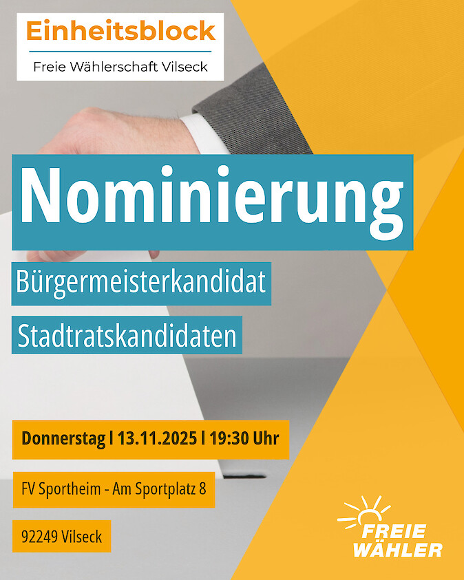 Es werden an diesem Abend der Bürgermeisterkandidat und die Stadtratskandidaten für die Kommunalwahlen 2026 aufgestellt. Stimmberechtigt sind alle Mitglieder des Einheitsblock Freie Wählerschaft Vilseck.
